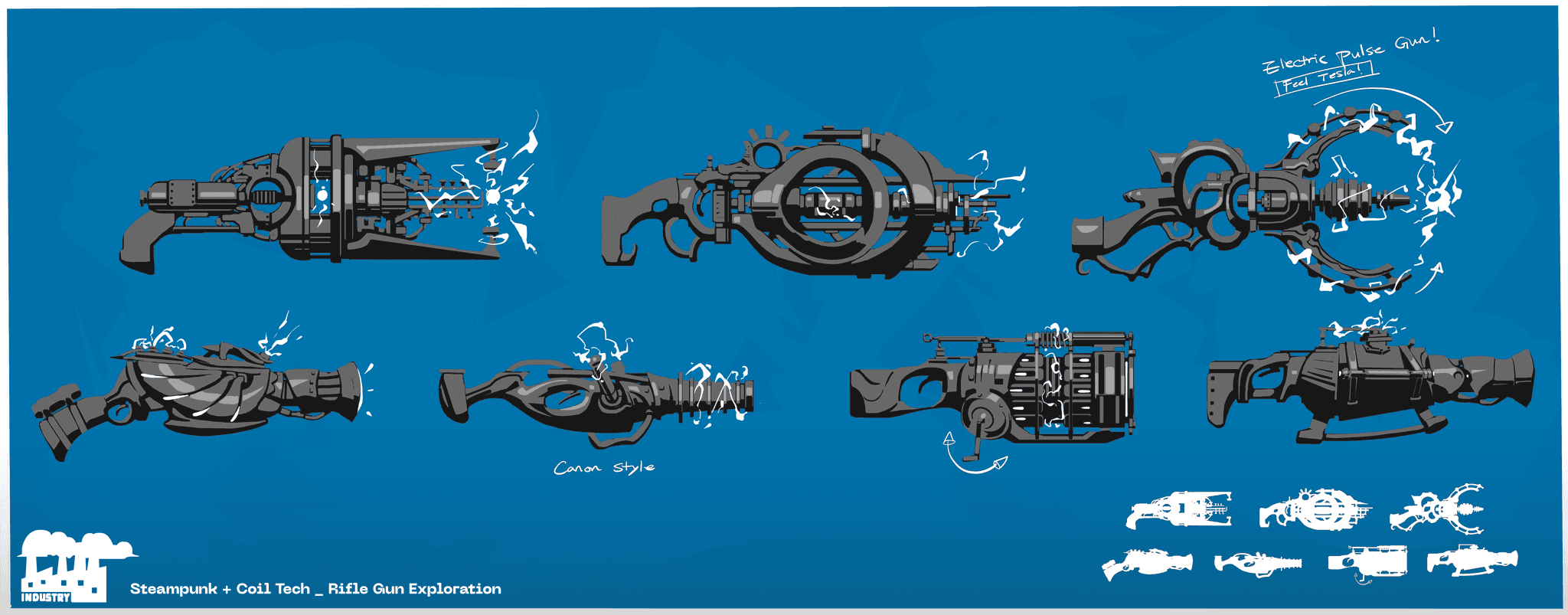 Old weapon explorations from 2019, inspired by a mix of Steampunk, Coil technology, and Diesel-punk aesthetics.