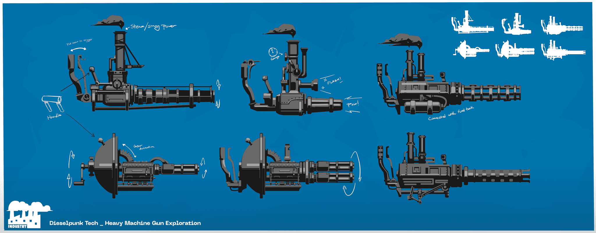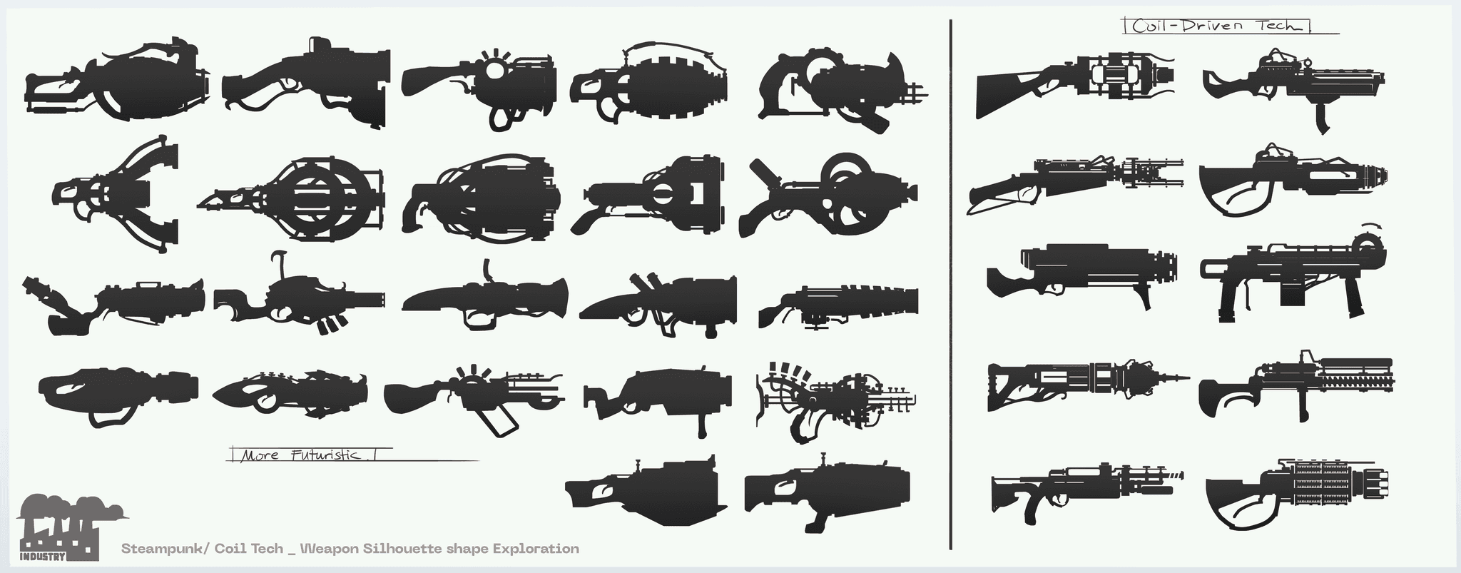 The explorations lean toward the abstract, pushing forms while still aligning with the mechanical and industrial feel of the genre.