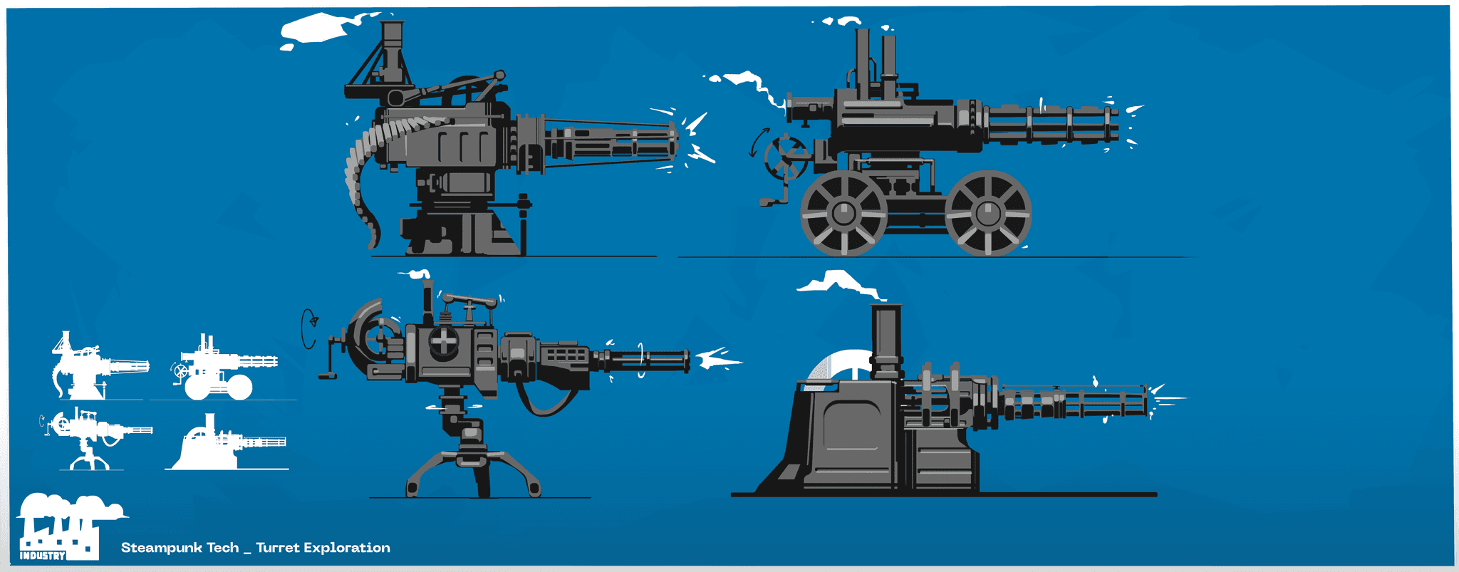 These were purely ideation sketches, focusing on shape language and keeping the designs readable within a Steampunk visual framework rather than finishing full concepts for 3D modeling and texture work.